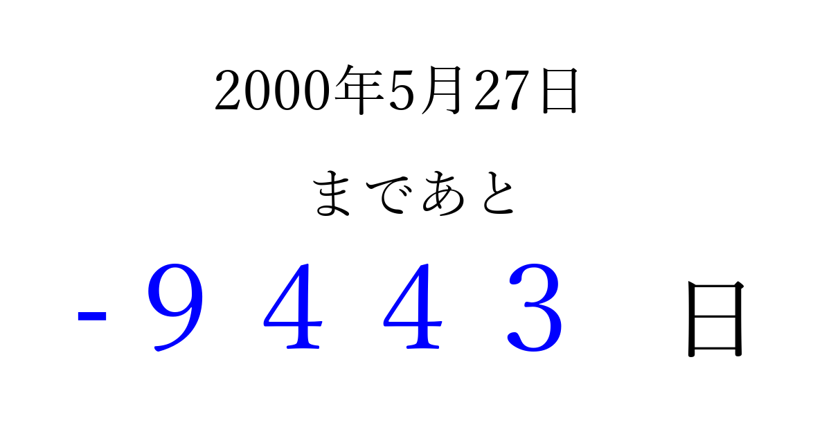 2000年5月27日(土)は もう 0000 日過ぎました 追加すると、トップページからすぐ選べるようになります ※2026/04/04現在の結果です。 最新の状態に更新する ↓シェアして、タイムライン上にカウントダウンを表示しよう!↓ 📤 この結果を共有する Tweet シェア Threads Bluesky 別の日付でカウントダウン 2000年5月のカレンダー このページをブックマークに追加すると、いつでもカウントダウンを確認できます。 (PC: Ctrl+D / Mac: ⌘+D) hitome-notes.comでは以下のページも運営しています。 指定日と期間から日付を計算 | ガチャ確率計算・シミュレーション | プライバシー・ポリシー 運営者:Avocado