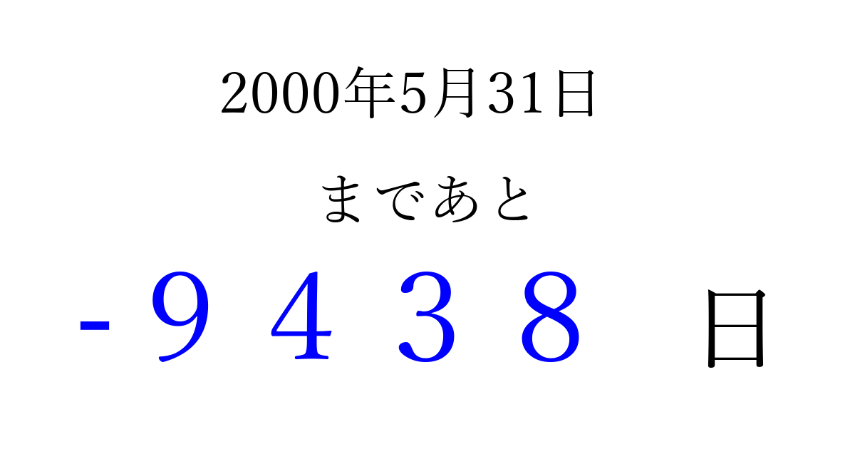 2000年5月31日(水)は もう 0000 日過ぎました 追加すると、トップページからすぐ選べるようになります ※2026/04/03現在の結果です。 最新の状態に更新する ↓シェアして、タイムライン上にカウントダウンを表示しよう!↓ 📤 この結果を共有する Tweet シェア Threads Bluesky 別の日付でカウントダウン 2000年5月のカレンダー このページをブックマークに追加すると、いつでもカウントダウンを確認できます。 (PC: Ctrl+D / Mac: ⌘+D) hitome-notes.comでは以下のページも運営しています。 指定日と期間から日付を計算 | ガチャ確率計算・シミュレーション | プライバシー・ポリシー 運営者:Avocado