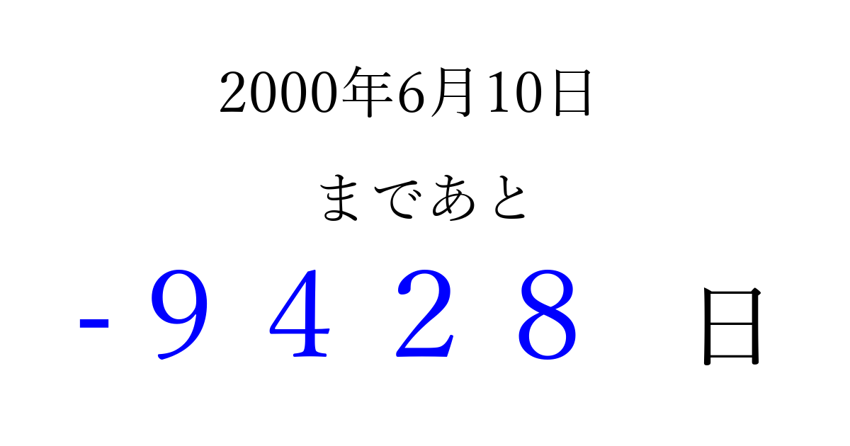 2000年6月10日(土)は もう 0000 日過ぎました 追加すると、トップページからすぐ選べるようになります ※2026/04/03現在の結果です。 最新の状態に更新する ↓シェアして、タイムライン上にカウントダウンを表示しよう!↓ 📤 この結果を共有する Tweet シェア Threads Bluesky 別の日付でカウントダウン 2000年6月のカレンダー このページをブックマークに追加すると、いつでもカウントダウンを確認できます。 (PC: Ctrl+D / Mac: ⌘+D) hitome-notes.comでは以下のページも運営しています。 指定日と期間から日付を計算 | ガチャ確率計算・シミュレーション | プライバシー・ポリシー 運営者:Avocado