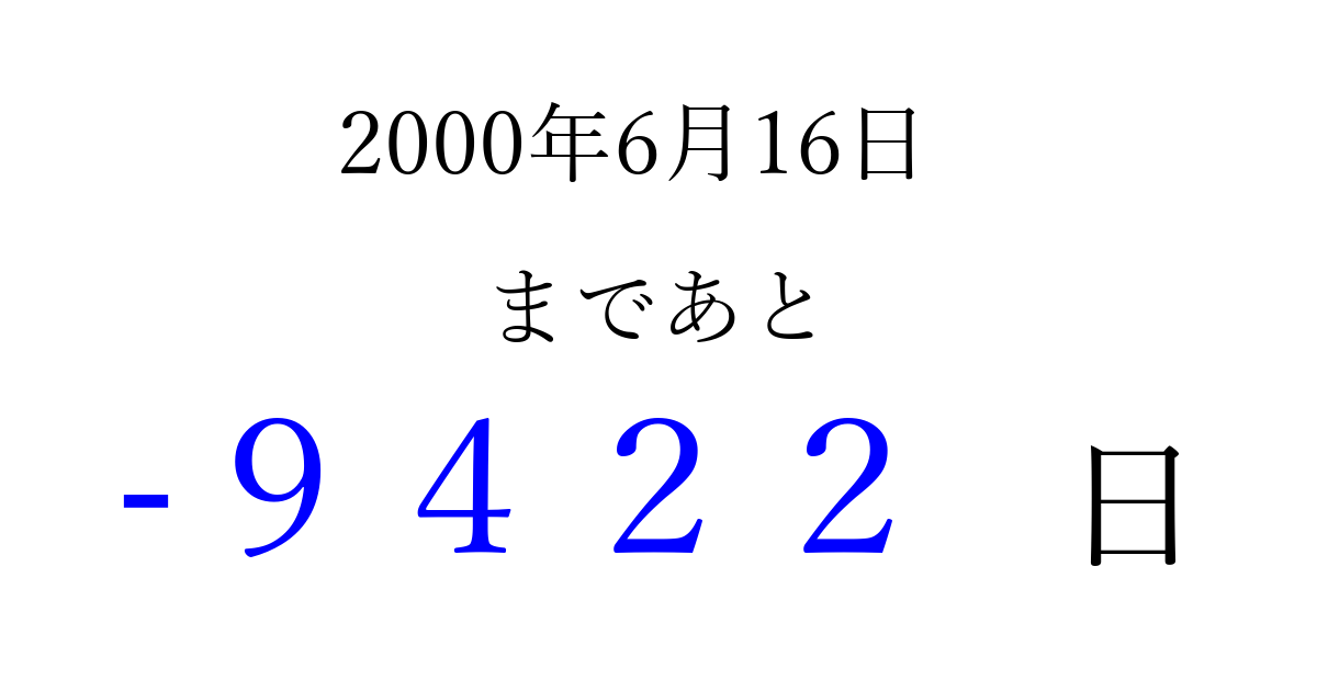 2000年6月16日(金)は もう 0000 日過ぎました 追加すると、トップページからすぐ選べるようになります ※2026/04/03現在の結果です。 最新の状態に更新する ↓シェアして、タイムライン上にカウントダウンを表示しよう!↓ 📤 この結果を共有する Tweet シェア Threads Bluesky 別の日付でカウントダウン 2000年6月のカレンダー このページをブックマークに追加すると、いつでもカウントダウンを確認できます。 (PC: Ctrl+D / Mac: ⌘+D) hitome-notes.comでは以下のページも運営しています。 指定日と期間から日付を計算 | ガチャ確率計算・シミュレーション | プライバシー・ポリシー 運営者:Avocado