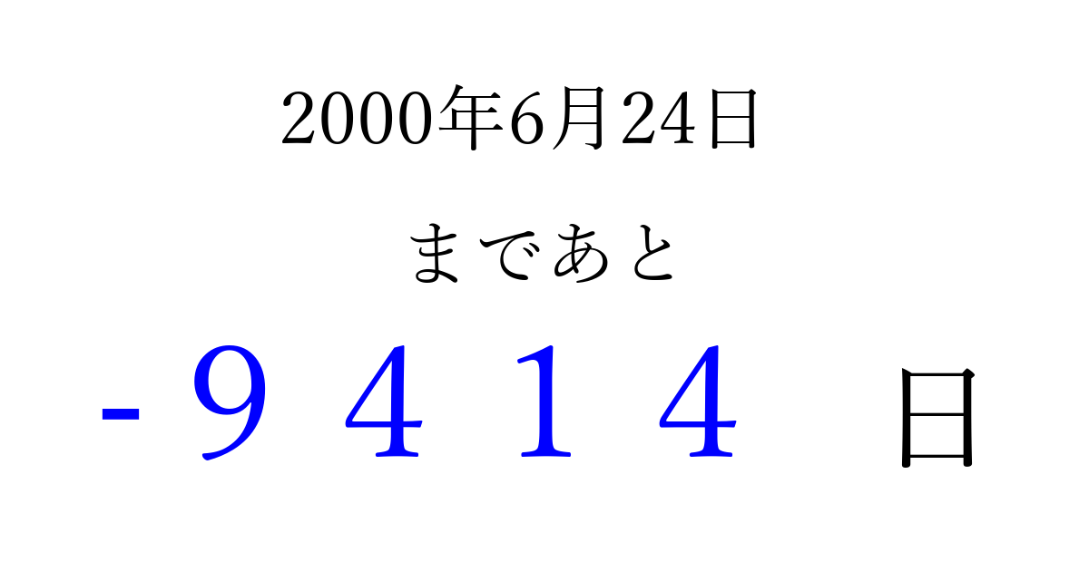 2000年6月24日(土)は もう 0000 日過ぎました 追加すると、トップページからすぐ選べるようになります ※2026/04/03現在の結果です。 最新の状態に更新する ↓シェアして、タイムライン上にカウントダウンを表示しよう!↓ 📤 この結果を共有する Tweet シェア Threads Bluesky 別の日付でカウントダウン 2000年6月のカレンダー このページをブックマークに追加すると、いつでもカウントダウンを確認できます。 (PC: Ctrl+D / Mac: ⌘+D) hitome-notes.comでは以下のページも運営しています。 指定日と期間から日付を計算 | ガチャ確率計算・シミュレーション | プライバシー・ポリシー 運営者:Avocado