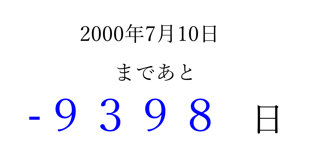 2000年7月10日(月)は もう 0000 日過ぎました 追加すると、トップページからすぐ選べるようになります ※2026/04/03現在の結果です。 最新の状態に更新する ↓シェアして、タイムライン上にカウントダウンを表示しよう!↓ 📤 この結果を共有する Tweet シェア Threads Bluesky 別の日付でカウントダウン 2000年7月のカレンダー このページをブックマークに追加すると、いつでもカウントダウンを確認できます。 (PC: Ctrl+D / Mac: ⌘+D) hitome-notes.comでは以下のページも運営しています。 指定日と期間から日付を計算 | ガチャ確率計算・シミュレーション | プライバシー・ポリシー 運営者:Avocado
