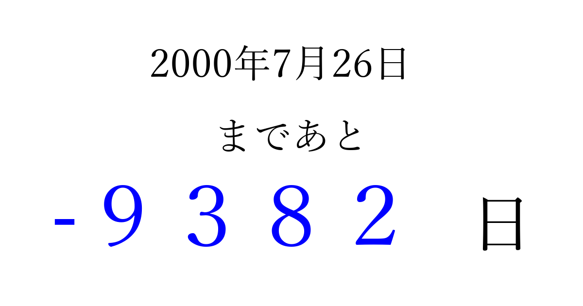 2000年7月26日(水)は もう 0000 日過ぎました 追加すると、トップページからすぐ選べるようになります ※2026/04/03現在の結果です。 最新の状態に更新する ↓シェアして、タイムライン上にカウントダウンを表示しよう!↓ 📤 この結果を共有する Tweet シェア Threads Bluesky 別の日付でカウントダウン 2000年7月のカレンダー このページをブックマークに追加すると、いつでもカウントダウンを確認できます。 (PC: Ctrl+D / Mac: ⌘+D) hitome-notes.comでは以下のページも運営しています。 指定日と期間から日付を計算 | ガチャ確率計算・シミュレーション | プライバシー・ポリシー 運営者:Avocado