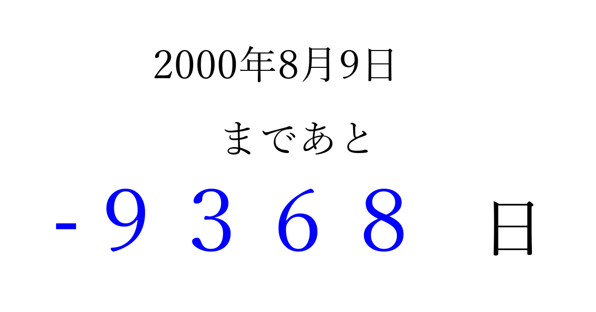 2000年8月9日(水)は もう 0000 日過ぎました 追加すると、トップページからすぐ選べるようになります ※2026/04/03現在の結果です。 最新の状態に更新する ↓シェアして、タイムライン上にカウントダウンを表示しよう!↓ 📤 この結果を共有する Tweet シェア Threads Bluesky 別の日付でカウントダウン 2000年8月のカレンダー このページをブックマークに追加すると、いつでもカウントダウンを確認できます。 (PC: Ctrl+D / Mac: ⌘+D) hitome-notes.comでは以下のページも運営しています。 指定日と期間から日付を計算 | ガチャ確率計算・シミュレーション | プライバシー・ポリシー 運営者:Avocado