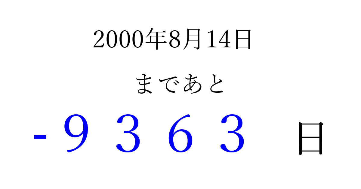 2000年8月14日(月)は もう 0000 日過ぎました 追加すると、トップページからすぐ選べるようになります ※2026/04/03現在の結果です。 最新の状態に更新する ↓シェアして、タイムライン上にカウントダウンを表示しよう!↓ 📤 この結果を共有する Tweet シェア Threads Bluesky 別の日付でカウントダウン 2000年8月のカレンダー このページをブックマークに追加すると、いつでもカウントダウンを確認できます。 (PC: Ctrl+D / Mac: ⌘+D) hitome-notes.comでは以下のページも運営しています。 指定日と期間から日付を計算 | ガチャ確率計算・シミュレーション | プライバシー・ポリシー 運営者:Avocado