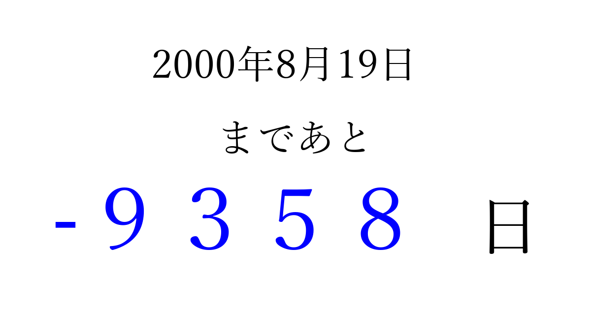 2000年8月19日(土)は もう 0000 日過ぎました 追加すると、トップページからすぐ選べるようになります ※2026/04/03現在の結果です。 最新の状態に更新する ↓シェアして、タイムライン上にカウントダウンを表示しよう!↓ 📤 この結果を共有する Tweet シェア Threads Bluesky 別の日付でカウントダウン 2000年8月のカレンダー このページをブックマークに追加すると、いつでもカウントダウンを確認できます。 (PC: Ctrl+D / Mac: ⌘+D) hitome-notes.comでは以下のページも運営しています。 指定日と期間から日付を計算 | ガチャ確率計算・シミュレーション | プライバシー・ポリシー 運営者:Avocado