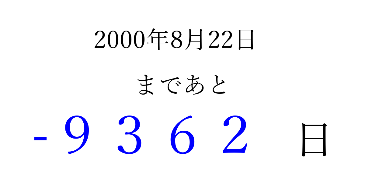 2000年8月22日(火)は もう 0000 日過ぎました 追加すると、トップページからすぐ選べるようになります ※2026/04/10現在の結果です。 最新の状態に更新する ↓シェアして、タイムライン上にカウントダウンを表示しよう!↓ 📤 この結果を共有する Tweet シェア Threads Bluesky 別の日付でカウントダウン 2000年8月のカレンダー このページをブックマークに追加すると、いつでもカウントダウンを確認できます。 (PC: Ctrl+D / Mac: ⌘+D) hitome-notes.comでは以下のページも運営しています。 指定日と期間から日付を計算 | ガチャ確率計算・シミュレーション | プライバシー・ポリシー 運営者:Avocado