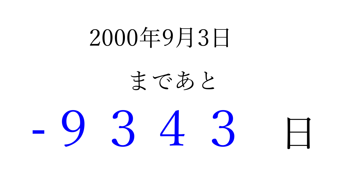 2000年9月3日(日)は もう 0000 日過ぎました 追加すると、トップページからすぐ選べるようになります ※2026/04/03現在の結果です。 最新の状態に更新する ↓シェアして、タイムライン上にカウントダウンを表示しよう!↓ 📤 この結果を共有する Tweet シェア Threads Bluesky 別の日付でカウントダウン 2000年9月のカレンダー このページをブックマークに追加すると、いつでもカウントダウンを確認できます。 (PC: Ctrl+D / Mac: ⌘+D) hitome-notes.comでは以下のページも運営しています。 指定日と期間から日付を計算 | ガチャ確率計算・シミュレーション | プライバシー・ポリシー 運営者:Avocado