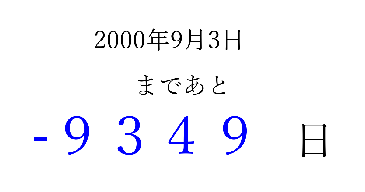2000年9月3日(日)は もう 0000 日過ぎました 追加すると、トップページからすぐ選べるようになります ※2026/04/09現在の結果です。 最新の状態に更新する ↓シェアして、タイムライン上にカウントダウンを表示しよう!↓ 📤 この結果を共有する Tweet シェア Threads Bluesky 別の日付でカウントダウン 2000年9月のカレンダー このページをブックマークに追加すると、いつでもカウントダウンを確認できます。 (PC: Ctrl+D / Mac: ⌘+D) hitome-notes.comでは以下のページも運営しています。 指定日と期間から日付を計算 | ガチャ確率計算・シミュレーション | プライバシー・ポリシー 運営者:Avocado