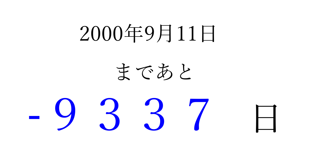 2000年9月11日(月)は もう 0000 日過ぎました 追加すると、トップページからすぐ選べるようになります ※2026/04/05現在の結果です。 最新の状態に更新する ↓シェアして、タイムライン上にカウントダウンを表示しよう!↓ 📤 この結果を共有する Tweet シェア Threads Bluesky 別の日付でカウントダウン 2000年9月のカレンダー このページをブックマークに追加すると、いつでもカウントダウンを確認できます。 (PC: Ctrl+D / Mac: ⌘+D) hitome-notes.comでは以下のページも運営しています。 指定日と期間から日付を計算 | ガチャ確率計算・シミュレーション | プライバシー・ポリシー 運営者:Avocado