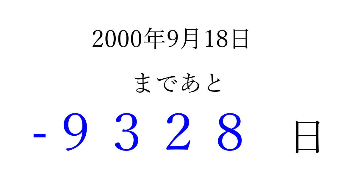 2000年9月18日(月)は もう 0000 日過ぎました 追加すると、トップページからすぐ選べるようになります ※2026/04/03現在の結果です。 最新の状態に更新する ↓シェアして、タイムライン上にカウントダウンを表示しよう!↓ 📤 この結果を共有する Tweet シェア Threads Bluesky 別の日付でカウントダウン 2000年9月のカレンダー このページをブックマークに追加すると、いつでもカウントダウンを確認できます。 (PC: Ctrl+D / Mac: ⌘+D) hitome-notes.comでは以下のページも運営しています。 指定日と期間から日付を計算 | ガチャ確率計算・シミュレーション | プライバシー・ポリシー 運営者:Avocado