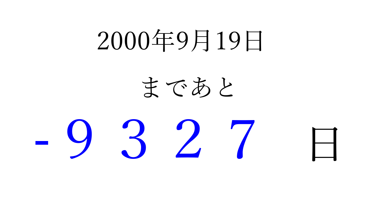 2000年9月19日(火)は もう 0000 日過ぎました 追加すると、トップページからすぐ選べるようになります ※2026/04/03現在の結果です。 最新の状態に更新する ↓シェアして、タイムライン上にカウントダウンを表示しよう!↓ 📤 この結果を共有する Tweet シェア Threads Bluesky 別の日付でカウントダウン 2000年9月のカレンダー このページをブックマークに追加すると、いつでもカウントダウンを確認できます。 (PC: Ctrl+D / Mac: ⌘+D) hitome-notes.comでは以下のページも運営しています。 指定日と期間から日付を計算 | ガチャ確率計算・シミュレーション | プライバシー・ポリシー 運営者:Avocado