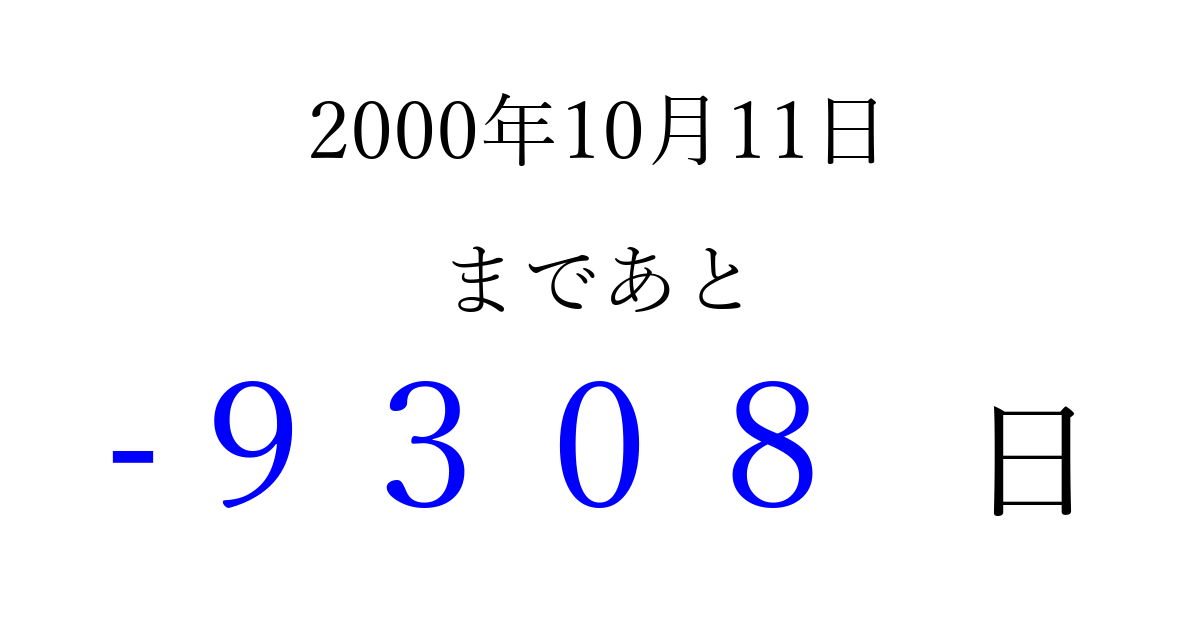 2000年10月11日(水)は もう 0000 日過ぎました 追加すると、トップページからすぐ選べるようになります ※2026/04/06現在の結果です。 最新の状態に更新する ↓シェアして、タイムライン上にカウントダウンを表示しよう!↓ 📤 この結果を共有する Tweet シェア Threads Bluesky 別の日付でカウントダウン 2000年10月のカレンダー このページをブックマークに追加すると、いつでもカウントダウンを確認できます。 (PC: Ctrl+D / Mac: ⌘+D) hitome-notes.comでは以下のページも運営しています。 指定日と期間から日付を計算 | ガチャ確率計算・シミュレーション | プライバシー・ポリシー 運営者:Avocado