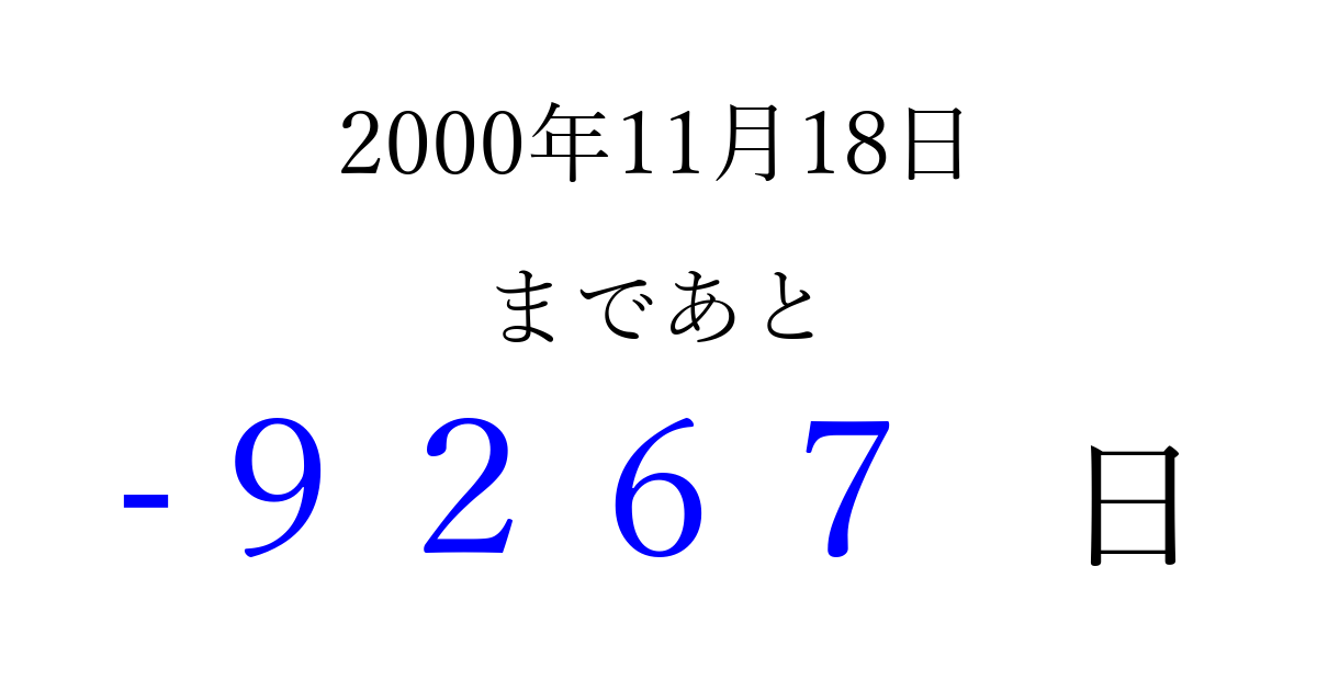 2000年11月18日(土)は もう 0000 日過ぎました 追加すると、トップページからすぐ選べるようになります ※2026/04/03現在の結果です。 最新の状態に更新する ↓シェアして、タイムライン上にカウントダウンを表示しよう!↓ 📤 この結果を共有する Tweet シェア Threads Bluesky 別の日付でカウントダウン 2000年11月のカレンダー このページをブックマークに追加すると、いつでもカウントダウンを確認できます。 (PC: Ctrl+D / Mac: ⌘+D) hitome-notes.comでは以下のページも運営しています。 指定日と期間から日付を計算 | ガチャ確率計算・シミュレーション | プライバシー・ポリシー 運営者:Avocado