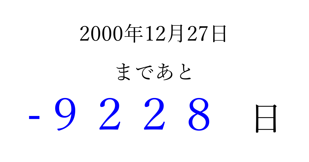2000年12月27日(水)は もう 0000 日過ぎました 追加すると、トップページからすぐ選べるようになります ※2026/04/03現在の結果です。 最新の状態に更新する ↓シェアして、タイムライン上にカウントダウンを表示しよう!↓ 📤 この結果を共有する Tweet シェア Threads Bluesky 別の日付でカウントダウン 2000年12月のカレンダー このページをブックマークに追加すると、いつでもカウントダウンを確認できます。 (PC: Ctrl+D / Mac: ⌘+D) hitome-notes.comでは以下のページも運営しています。 指定日と期間から日付を計算 | ガチャ確率計算・シミュレーション | プライバシー・ポリシー 運営者:Avocado