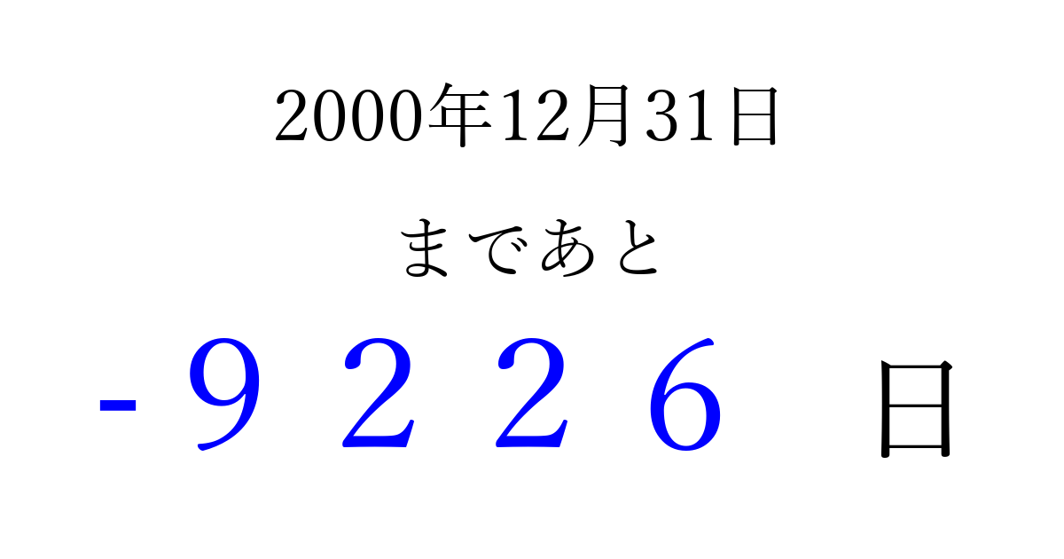 2000年12月31日(日)は もう 0000 日過ぎました 追加すると、トップページからすぐ選べるようになります ※2026/04/05現在の結果です。 最新の状態に更新する ↓シェアして、タイムライン上にカウントダウンを表示しよう!↓ 📤 この結果を共有する Tweet シェア Threads Bluesky 別の日付でカウントダウン 2000年12月のカレンダー このページをブックマークに追加すると、いつでもカウントダウンを確認できます。 (PC: Ctrl+D / Mac: ⌘+D) hitome-notes.comでは以下のページも運営しています。 指定日と期間から日付を計算 | ガチャ確率計算・シミュレーション | プライバシー・ポリシー 運営者:Avocado