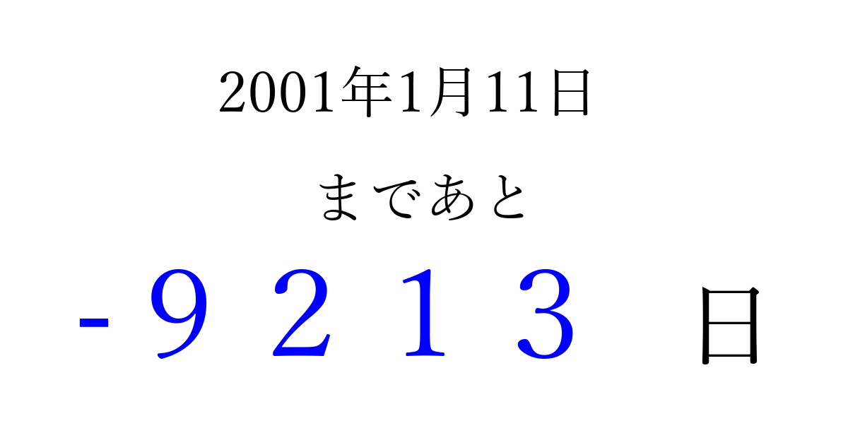 2001年1月11日(木)は もう 0000 日過ぎました 追加すると、トップページからすぐ選べるようになります ※2026/04/03現在の結果です。 最新の状態に更新する ↓シェアして、タイムライン上にカウントダウンを表示しよう!↓ 📤 この結果を共有する Tweet シェア Threads Bluesky 別の日付でカウントダウン 2001年1月のカレンダー このページをブックマークに追加すると、いつでもカウントダウンを確認できます。 (PC: Ctrl+D / Mac: ⌘+D) hitome-notes.comでは以下のページも運営しています。 指定日と期間から日付を計算 | ガチャ確率計算・シミュレーション | プライバシー・ポリシー 運営者:Avocado