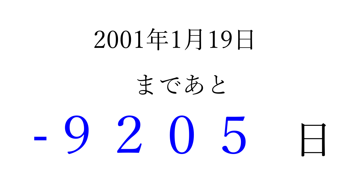 2001年1月19日(金)は もう 0000 日過ぎました 追加すると、トップページからすぐ選べるようになります ※2026/04/03現在の結果です。 最新の状態に更新する ↓シェアして、タイムライン上にカウントダウンを表示しよう!↓ 📤 この結果を共有する Tweet シェア Threads Bluesky 別の日付でカウントダウン 2001年1月のカレンダー このページをブックマークに追加すると、いつでもカウントダウンを確認できます。 (PC: Ctrl+D / Mac: ⌘+D) hitome-notes.comでは以下のページも運営しています。 指定日と期間から日付を計算 | ガチャ確率計算・シミュレーション | プライバシー・ポリシー 運営者:Avocado
