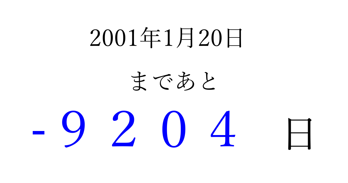 2001年1月20日(土)は もう 0000 日過ぎました 追加すると、トップページからすぐ選べるようになります ※2026/04/03現在の結果です。 最新の状態に更新する ↓シェアして、タイムライン上にカウントダウンを表示しよう!↓ 📤 この結果を共有する Tweet シェア Threads Bluesky 別の日付でカウントダウン 2001年1月のカレンダー このページをブックマークに追加すると、いつでもカウントダウンを確認できます。 (PC: Ctrl+D / Mac: ⌘+D) hitome-notes.comでは以下のページも運営しています。 指定日と期間から日付を計算 | ガチャ確率計算・シミュレーション | プライバシー・ポリシー 運営者:Avocado