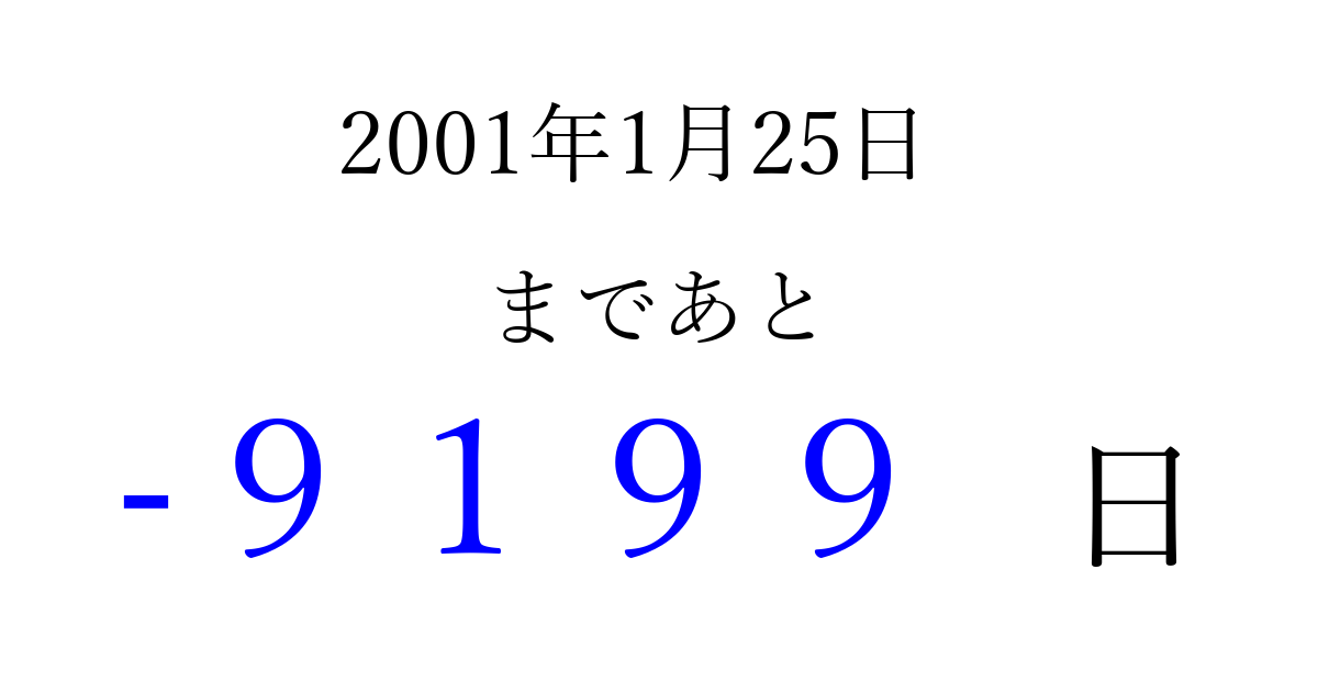 2001年1月25日(木)は もう 0000 日過ぎました 追加すると、トップページからすぐ選べるようになります ※2026/04/03現在の結果です。 最新の状態に更新する ↓シェアして、タイムライン上にカウントダウンを表示しよう!↓ 📤 この結果を共有する Tweet シェア Threads Bluesky 別の日付でカウントダウン 2001年1月のカレンダー このページをブックマークに追加すると、いつでもカウントダウンを確認できます。 (PC: Ctrl+D / Mac: ⌘+D) hitome-notes.comでは以下のページも運営しています。 指定日と期間から日付を計算 | ガチャ確率計算・シミュレーション | プライバシー・ポリシー 運営者:Avocado