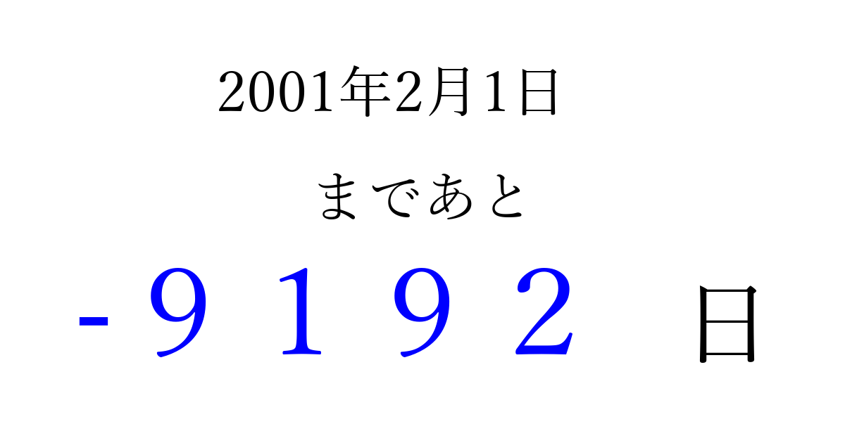 2001年2月1日(木)は もう 0000 日過ぎました 追加すると、トップページからすぐ選べるようになります ※2026/04/03現在の結果です。 最新の状態に更新する ↓シェアして、タイムライン上にカウントダウンを表示しよう!↓ 📤 この結果を共有する Tweet シェア Threads Bluesky 別の日付でカウントダウン 2001年2月のカレンダー このページをブックマークに追加すると、いつでもカウントダウンを確認できます。 (PC: Ctrl+D / Mac: ⌘+D) hitome-notes.comでは以下のページも運営しています。 指定日と期間から日付を計算 | ガチャ確率計算・シミュレーション | プライバシー・ポリシー 運営者:Avocado