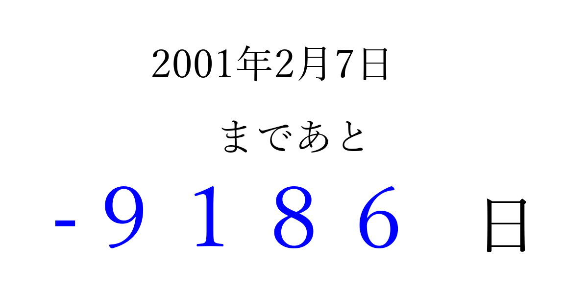 2001年2月7日(水)は もう 0000 日過ぎました 追加すると、トップページからすぐ選べるようになります ※2026/04/03現在の結果です。 最新の状態に更新する ↓シェアして、タイムライン上にカウントダウンを表示しよう!↓ 📤 この結果を共有する Tweet シェア Threads Bluesky 別の日付でカウントダウン 2001年2月のカレンダー このページをブックマークに追加すると、いつでもカウントダウンを確認できます。 (PC: Ctrl+D / Mac: ⌘+D) hitome-notes.comでは以下のページも運営しています。 指定日と期間から日付を計算 | ガチャ確率計算・シミュレーション | プライバシー・ポリシー 運営者:Avocado