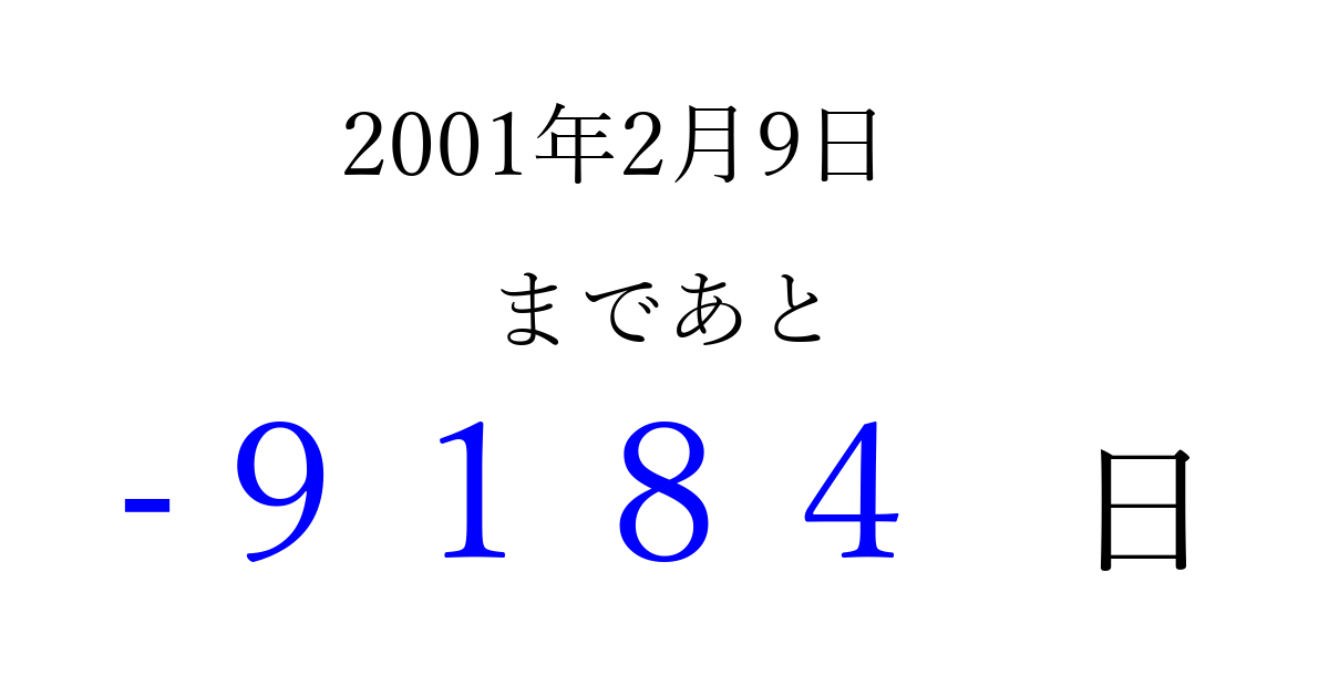2001年2月9日(金)は もう 0000 日過ぎました 追加すると、トップページからすぐ選べるようになります ※2026/04/03現在の結果です。 最新の状態に更新する ↓シェアして、タイムライン上にカウントダウンを表示しよう!↓ 📤 この結果を共有する Tweet シェア Threads Bluesky 別の日付でカウントダウン 2001年2月のカレンダー このページをブックマークに追加すると、いつでもカウントダウンを確認できます。 (PC: Ctrl+D / Mac: ⌘+D) hitome-notes.comでは以下のページも運営しています。 指定日と期間から日付を計算 | ガチャ確率計算・シミュレーション | プライバシー・ポリシー 運営者:Avocado