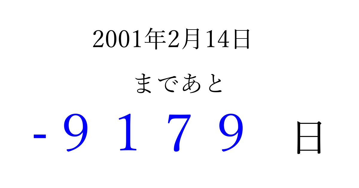 2001年2月14日(水)は もう 0000 日過ぎました 追加すると、トップページからすぐ選べるようになります ※2026/04/03現在の結果です。 最新の状態に更新する ↓シェアして、タイムライン上にカウントダウンを表示しよう!↓ 📤 この結果を共有する Tweet シェア Threads Bluesky 別の日付でカウントダウン 2001年2月のカレンダー このページをブックマークに追加すると、いつでもカウントダウンを確認できます。 (PC: Ctrl+D / Mac: ⌘+D) hitome-notes.comでは以下のページも運営しています。 指定日と期間から日付を計算 | ガチャ確率計算・シミュレーション | プライバシー・ポリシー 運営者:Avocado