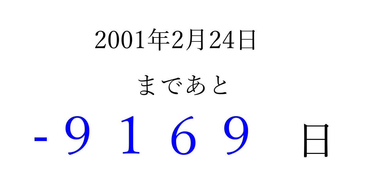 2001年2月24日(土)は もう 0000 日過ぎました 追加すると、トップページからすぐ選べるようになります ※2026/04/03現在の結果です。 最新の状態に更新する ↓シェアして、タイムライン上にカウントダウンを表示しよう!↓ 📤 この結果を共有する Tweet シェア Threads Bluesky 別の日付でカウントダウン 2001年2月のカレンダー このページをブックマークに追加すると、いつでもカウントダウンを確認できます。 (PC: Ctrl+D / Mac: ⌘+D) hitome-notes.comでは以下のページも運営しています。 指定日と期間から日付を計算 | ガチャ確率計算・シミュレーション | プライバシー・ポリシー 運営者:Avocado