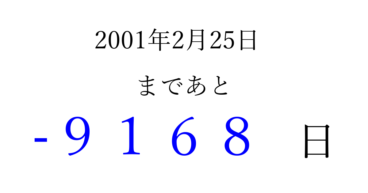 2001年2月25日(日)は もう 0000 日過ぎました 追加すると、トップページからすぐ選べるようになります ※2026/04/03現在の結果です。 最新の状態に更新する ↓シェアして、タイムライン上にカウントダウンを表示しよう!↓ 📤 この結果を共有する Tweet シェア Threads Bluesky 別の日付でカウントダウン 2001年2月のカレンダー このページをブックマークに追加すると、いつでもカウントダウンを確認できます。 (PC: Ctrl+D / Mac: ⌘+D) hitome-notes.comでは以下のページも運営しています。 指定日と期間から日付を計算 | ガチャ確率計算・シミュレーション | プライバシー・ポリシー 運営者:Avocado