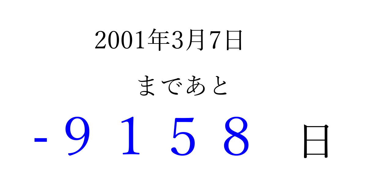 2001年3月7日(水)は もう 0000 日過ぎました 追加すると、トップページからすぐ選べるようになります ※2026/04/03現在の結果です。 最新の状態に更新する ↓シェアして、タイムライン上にカウントダウンを表示しよう!↓ 📤 この結果を共有する Tweet シェア Threads Bluesky 別の日付でカウントダウン 2001年3月のカレンダー このページをブックマークに追加すると、いつでもカウントダウンを確認できます。 (PC: Ctrl+D / Mac: ⌘+D) hitome-notes.comでは以下のページも運営しています。 指定日と期間から日付を計算 | ガチャ確率計算・シミュレーション | プライバシー・ポリシー 運営者:Avocado