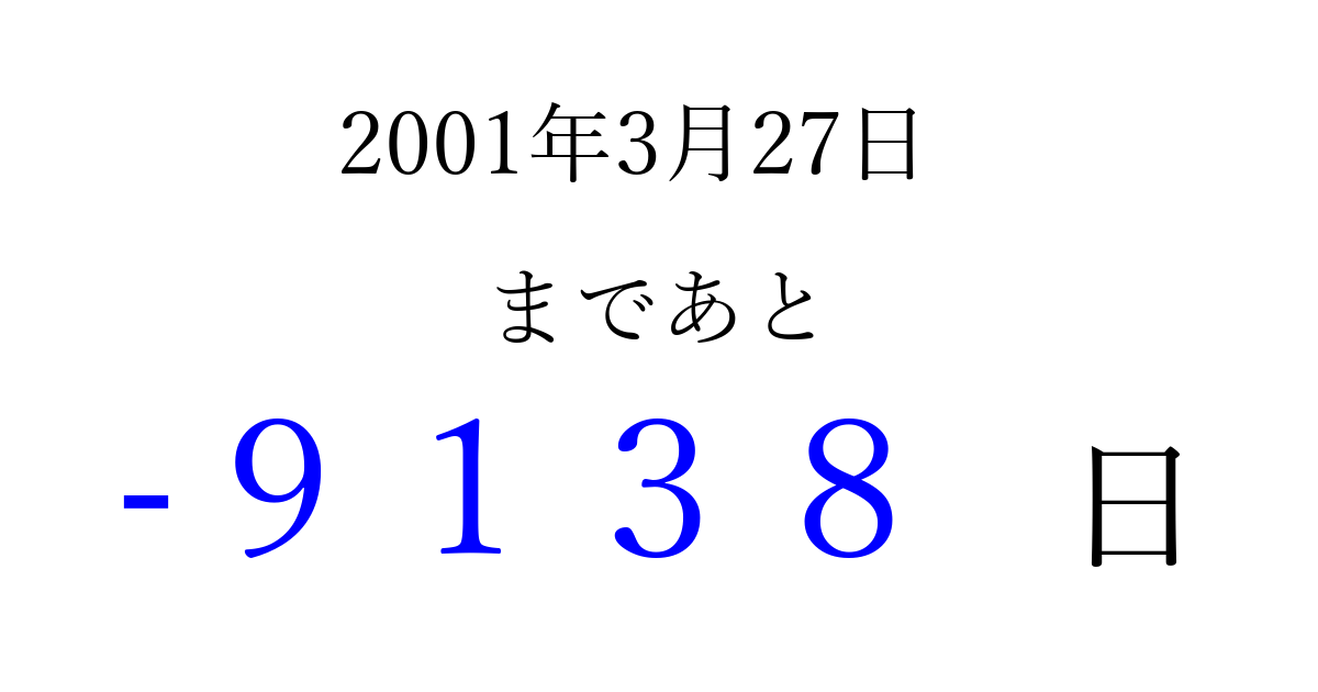 2001年3月27日(火)は もう 0000 日過ぎました 追加すると、トップページからすぐ選べるようになります ※2026/04/03現在の結果です。 最新の状態に更新する ↓シェアして、タイムライン上にカウントダウンを表示しよう!↓ 📤 この結果を共有する Tweet シェア Threads Bluesky 別の日付でカウントダウン 2001年3月のカレンダー このページをブックマークに追加すると、いつでもカウントダウンを確認できます。 (PC: Ctrl+D / Mac: ⌘+D) hitome-notes.comでは以下のページも運営しています。 指定日と期間から日付を計算 | ガチャ確率計算・シミュレーション | プライバシー・ポリシー 運営者:Avocado