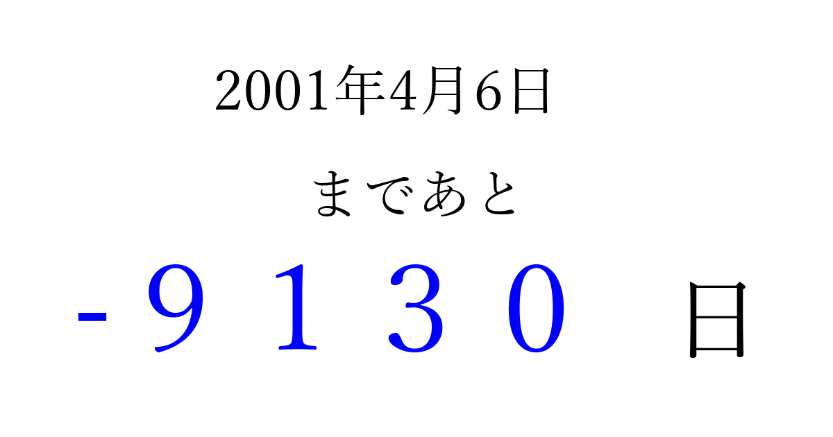 2001年4月6日(金)は もう 0000 日過ぎました 追加すると、トップページからすぐ選べるようになります ※2026/04/05現在の結果です。 最新の状態に更新する ↓シェアして、タイムライン上にカウントダウンを表示しよう!↓ 📤 この結果を共有する Tweet シェア Threads Bluesky 別の日付でカウントダウン 2001年4月のカレンダー このページをブックマークに追加すると、いつでもカウントダウンを確認できます。 (PC: Ctrl+D / Mac: ⌘+D) hitome-notes.comでは以下のページも運営しています。 指定日と期間から日付を計算 | ガチャ確率計算・シミュレーション | プライバシー・ポリシー 運営者:Avocado