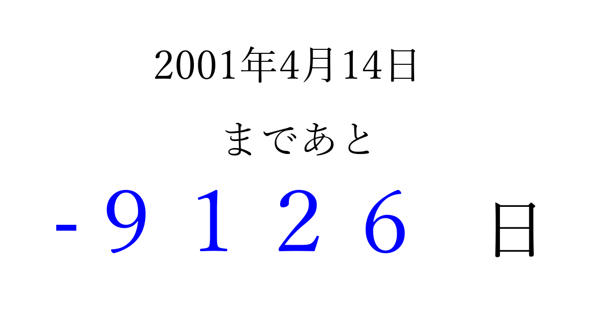 2001年4月14日(土)は もう 0000 日過ぎました 追加すると、トップページからすぐ選べるようになります ※2026/04/09現在の結果です。 最新の状態に更新する ↓シェアして、タイムライン上にカウントダウンを表示しよう!↓ 📤 この結果を共有する Tweet シェア Threads Bluesky 別の日付でカウントダウン 2001年4月のカレンダー このページをブックマークに追加すると、いつでもカウントダウンを確認できます。 (PC: Ctrl+D / Mac: ⌘+D) hitome-notes.comでは以下のページも運営しています。 指定日と期間から日付を計算 | ガチャ確率計算・シミュレーション | プライバシー・ポリシー 運営者:Avocado