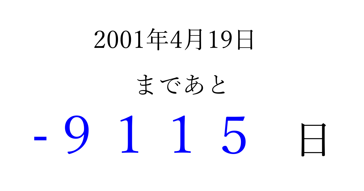 2001年4月19日(木)は もう 0000 日過ぎました 追加すると、トップページからすぐ選べるようになります ※2026/04/03現在の結果です。 最新の状態に更新する ↓シェアして、タイムライン上にカウントダウンを表示しよう!↓ 📤 この結果を共有する Tweet シェア Threads Bluesky 別の日付でカウントダウン 2001年4月のカレンダー このページをブックマークに追加すると、いつでもカウントダウンを確認できます。 (PC: Ctrl+D / Mac: ⌘+D) hitome-notes.comでは以下のページも運営しています。 指定日と期間から日付を計算 | ガチャ確率計算・シミュレーション | プライバシー・ポリシー 運営者:Avocado