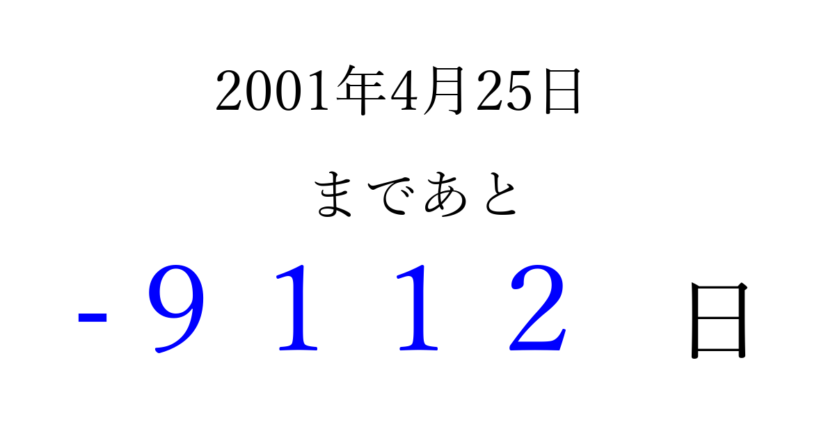 2001年4月25日(水)は もう 0000 日過ぎました 追加すると、トップページからすぐ選べるようになります ※2026/04/06現在の結果です。 最新の状態に更新する ↓シェアして、タイムライン上にカウントダウンを表示しよう!↓ 📤 この結果を共有する Tweet シェア Threads Bluesky 別の日付でカウントダウン 2001年4月のカレンダー このページをブックマークに追加すると、いつでもカウントダウンを確認できます。 (PC: Ctrl+D / Mac: ⌘+D) hitome-notes.comでは以下のページも運営しています。 指定日と期間から日付を計算 | ガチャ確率計算・シミュレーション | プライバシー・ポリシー 運営者:Avocado