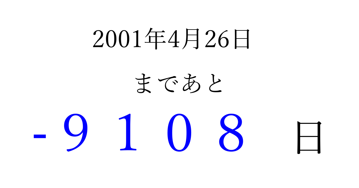 2001年4月26日(木)は もう 0000 日過ぎました 追加すると、トップページからすぐ選べるようになります ※2026/04/03現在の結果です。 最新の状態に更新する ↓シェアして、タイムライン上にカウントダウンを表示しよう!↓ 📤 この結果を共有する Tweet シェア Threads Bluesky 別の日付でカウントダウン 2001年4月のカレンダー このページをブックマークに追加すると、いつでもカウントダウンを確認できます。 (PC: Ctrl+D / Mac: ⌘+D) hitome-notes.comでは以下のページも運営しています。 指定日と期間から日付を計算 | ガチャ確率計算・シミュレーション | プライバシー・ポリシー 運営者:Avocado