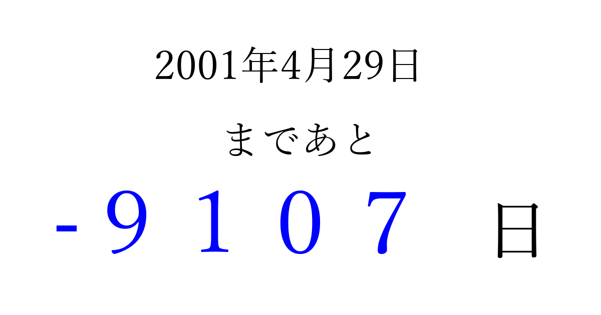2001年4月29日(日)は もう 0000 日過ぎました 追加すると、トップページからすぐ選べるようになります ※2026/04/05現在の結果です。 最新の状態に更新する ↓シェアして、タイムライン上にカウントダウンを表示しよう!↓ 📤 この結果を共有する Tweet シェア Threads Bluesky 別の日付でカウントダウン 2001年4月のカレンダー このページをブックマークに追加すると、いつでもカウントダウンを確認できます。 (PC: Ctrl+D / Mac: ⌘+D) hitome-notes.comでは以下のページも運営しています。 指定日と期間から日付を計算 | ガチャ確率計算・シミュレーション | プライバシー・ポリシー 運営者:Avocado