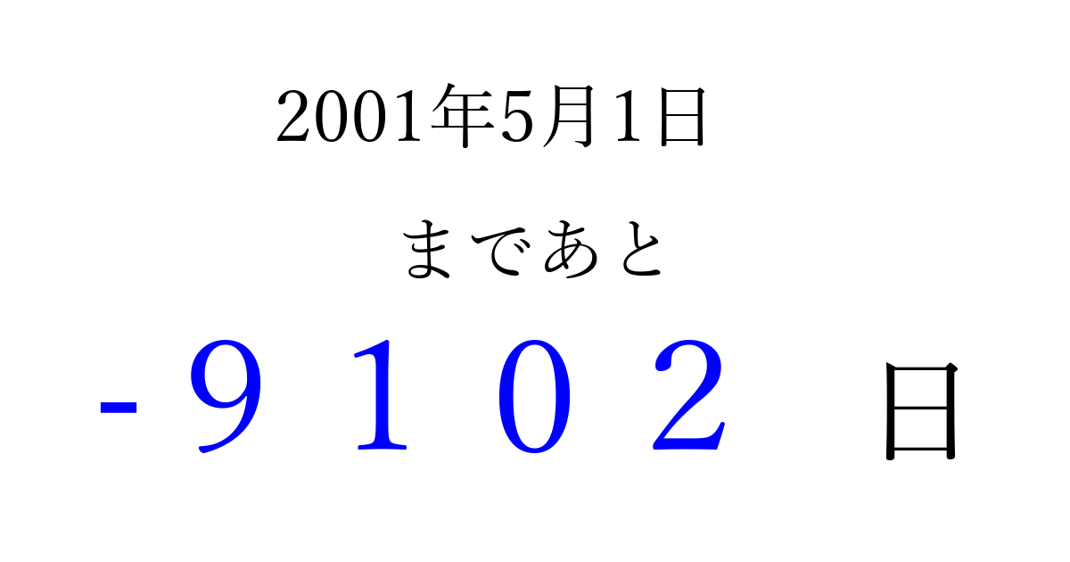 2001年5月1日(火)は もう 0000 日過ぎました 追加すると、トップページからすぐ選べるようになります ※2026/04/02現在の結果です。 最新の状態に更新する ↓シェアして、タイムライン上にカウントダウンを表示しよう!↓ 📤 この結果を共有する Tweet シェア Threads Bluesky 別の日付でカウントダウン 2001年5月のカレンダー このページをブックマークに追加すると、いつでもカウントダウンを確認できます。 (PC: Ctrl+D / Mac: ⌘+D) hitome-notes.comでは以下のページも運営しています。 指定日と期間から日付を計算 | ガチャ確率計算・シミュレーション | プライバシー・ポリシー 運営者:Avocado