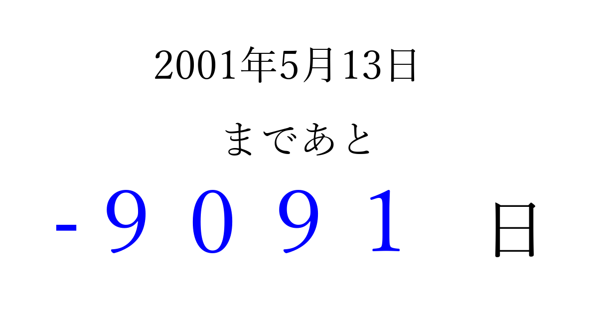 2001年5月13日(日)は もう 0000 日過ぎました 追加すると、トップページからすぐ選べるようになります ※2026/04/03現在の結果です。 最新の状態に更新する ↓シェアして、タイムライン上にカウントダウンを表示しよう!↓ 📤 この結果を共有する Tweet シェア Threads Bluesky 別の日付でカウントダウン 2001年5月のカレンダー このページをブックマークに追加すると、いつでもカウントダウンを確認できます。 (PC: Ctrl+D / Mac: ⌘+D) hitome-notes.comでは以下のページも運営しています。 指定日と期間から日付を計算 | ガチャ確率計算・シミュレーション | プライバシー・ポリシー 運営者:Avocado