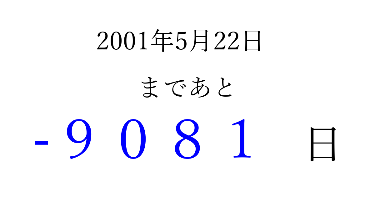 2001年5月22日(火)は もう 0000 日過ぎました 追加すると、トップページからすぐ選べるようになります ※2026/04/02現在の結果です。 最新の状態に更新する ↓シェアして、タイムライン上にカウントダウンを表示しよう!↓ 📤 この結果を共有する Tweet シェア Threads Bluesky 別の日付でカウントダウン 2001年5月のカレンダー このページをブックマークに追加すると、いつでもカウントダウンを確認できます。 (PC: Ctrl+D / Mac: ⌘+D) hitome-notes.comでは以下のページも運営しています。 指定日と期間から日付を計算 | ガチャ確率計算・シミュレーション | プライバシー・ポリシー 運営者:Avocado