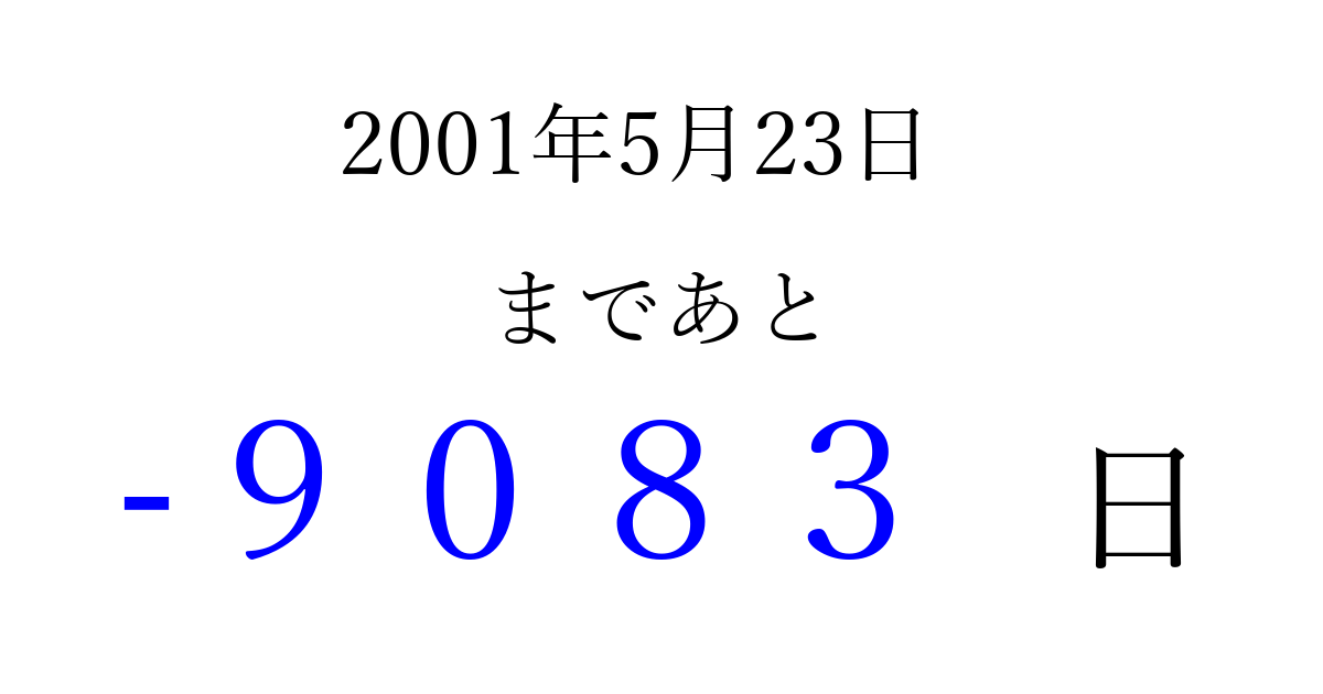 2001年5月23日(水)は もう 0000 日過ぎました 追加すると、トップページからすぐ選べるようになります ※2026/04/05現在の結果です。 最新の状態に更新する ↓シェアして、タイムライン上にカウントダウンを表示しよう!↓ 📤 この結果を共有する Tweet シェア Threads Bluesky 別の日付でカウントダウン 2001年5月のカレンダー このページをブックマークに追加すると、いつでもカウントダウンを確認できます。 (PC: Ctrl+D / Mac: ⌘+D) hitome-notes.comでは以下のページも運営しています。 指定日と期間から日付を計算 | ガチャ確率計算・シミュレーション | プライバシー・ポリシー 運営者:Avocado