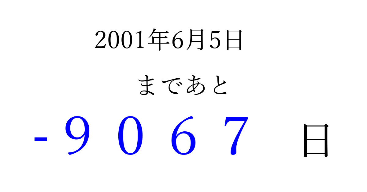 2001年6月5日(火)は もう 0000 日過ぎました 追加すると、トップページからすぐ選べるようになります ※2026/04/02現在の結果です。 最新の状態に更新する ↓シェアして、タイムライン上にカウントダウンを表示しよう!↓ 📤 この結果を共有する Tweet シェア Threads Bluesky 別の日付でカウントダウン 2001年6月のカレンダー このページをブックマークに追加すると、いつでもカウントダウンを確認できます。 (PC: Ctrl+D / Mac: ⌘+D) hitome-notes.comでは以下のページも運営しています。 指定日と期間から日付を計算 | ガチャ確率計算・シミュレーション | プライバシー・ポリシー 運営者:Avocado