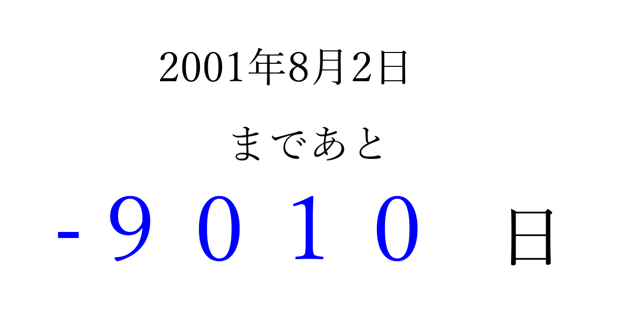 2001年8月2日(木)は もう 0000 日過ぎました 追加すると、トップページからすぐ選べるようになります ※2026/04/03現在の結果です。 最新の状態に更新する ↓シェアして、タイムライン上にカウントダウンを表示しよう!↓ 📤 この結果を共有する Tweet シェア Threads Bluesky 別の日付でカウントダウン 2001年8月のカレンダー このページをブックマークに追加すると、いつでもカウントダウンを確認できます。 (PC: Ctrl+D / Mac: ⌘+D) hitome-notes.comでは以下のページも運営しています。 指定日と期間から日付を計算 | ガチャ確率計算・シミュレーション | プライバシー・ポリシー 運営者:Avocado