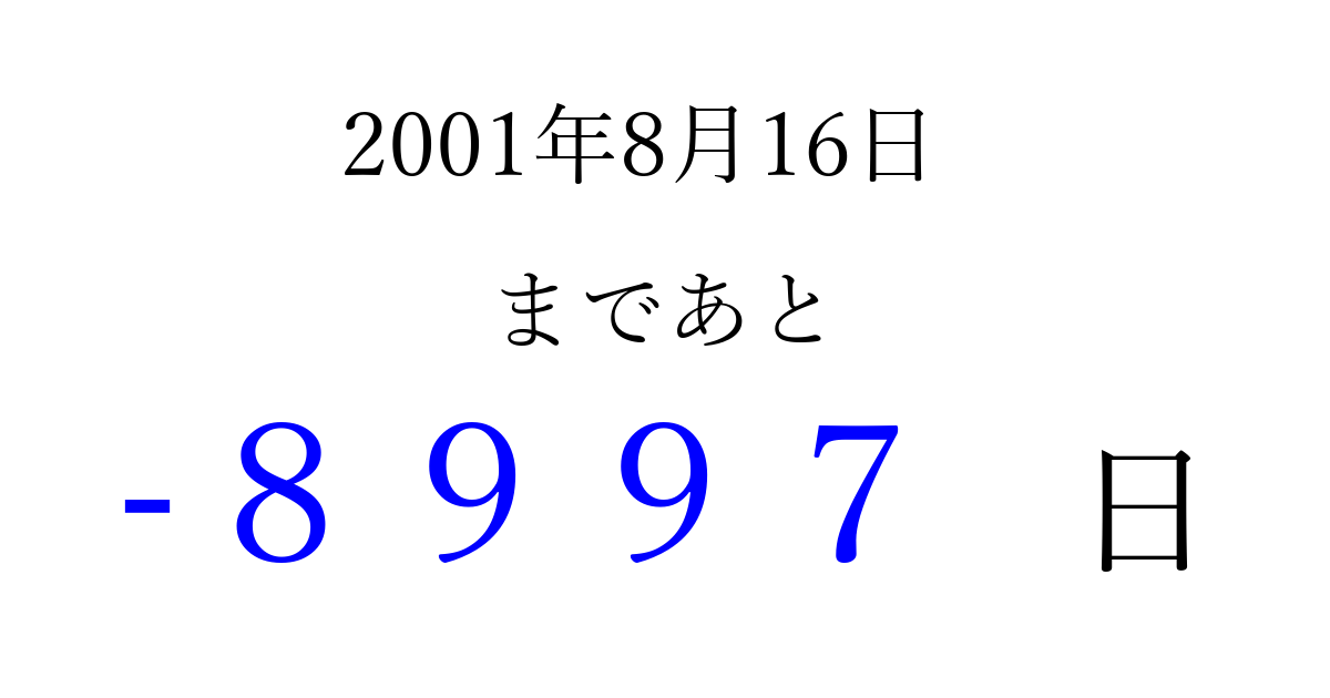 2001年8月16日(木)は もう 0000 日過ぎました 追加すると、トップページからすぐ選べるようになります ※2026/04/04現在の結果です。 最新の状態に更新する ↓シェアして、タイムライン上にカウントダウンを表示しよう!↓ 📤 この結果を共有する Tweet シェア Threads Bluesky 別の日付でカウントダウン 2001年8月のカレンダー このページをブックマークに追加すると、いつでもカウントダウンを確認できます。 (PC: Ctrl+D / Mac: ⌘+D) hitome-notes.comでは以下のページも運営しています。 指定日と期間から日付を計算 | ガチャ確率計算・シミュレーション | プライバシー・ポリシー 運営者:Avocado