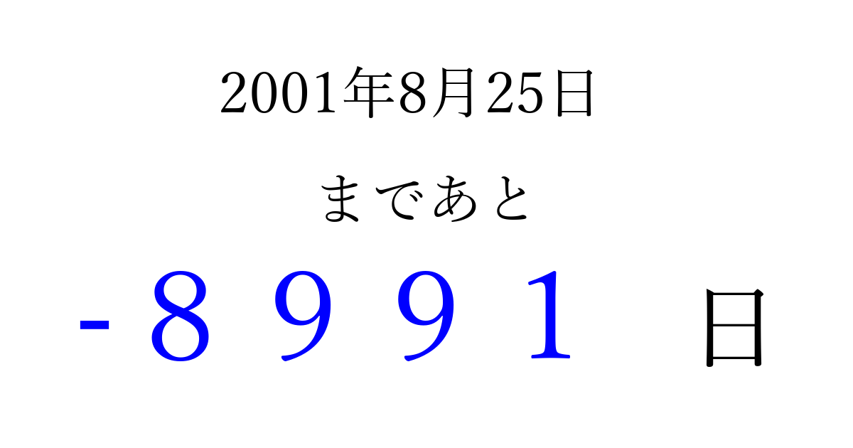 2001年8月25日(土)は もう 0000 日過ぎました 追加すると、トップページからすぐ選べるようになります ※2026/04/07現在の結果です。 最新の状態に更新する ↓シェアして、タイムライン上にカウントダウンを表示しよう!↓ 📤 この結果を共有する Tweet シェア Threads Bluesky 別の日付でカウントダウン 2001年8月のカレンダー このページをブックマークに追加すると、いつでもカウントダウンを確認できます。 (PC: Ctrl+D / Mac: ⌘+D) hitome-notes.comでは以下のページも運営しています。 指定日と期間から日付を計算 | ガチャ確率計算・シミュレーション | プライバシー・ポリシー 運営者:Avocado