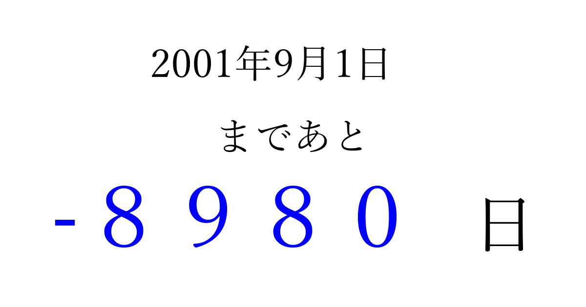 2001年9月1日(土)は もう 0000 日過ぎました 追加すると、トップページからすぐ選べるようになります ※2026/04/03現在の結果です。 最新の状態に更新する ↓シェアして、タイムライン上にカウントダウンを表示しよう!↓ 📤 この結果を共有する Tweet シェア Threads Bluesky 別の日付でカウントダウン 2001年9月のカレンダー このページをブックマークに追加すると、いつでもカウントダウンを確認できます。 (PC: Ctrl+D / Mac: ⌘+D) hitome-notes.comでは以下のページも運営しています。 指定日と期間から日付を計算 | ガチャ確率計算・シミュレーション | プライバシー・ポリシー 運営者:Avocado