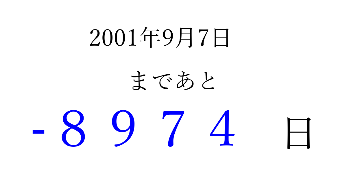 2001年9月7日(金)は もう 0000 日過ぎました 追加すると、トップページからすぐ選べるようになります ※2026/04/03現在の結果です。 最新の状態に更新する ↓シェアして、タイムライン上にカウントダウンを表示しよう!↓ 📤 この結果を共有する Tweet シェア Threads Bluesky 別の日付でカウントダウン 2001年9月のカレンダー このページをブックマークに追加すると、いつでもカウントダウンを確認できます。 (PC: Ctrl+D / Mac: ⌘+D) hitome-notes.comでは以下のページも運営しています。 指定日と期間から日付を計算 | ガチャ確率計算・シミュレーション | プライバシー・ポリシー 運営者:Avocado