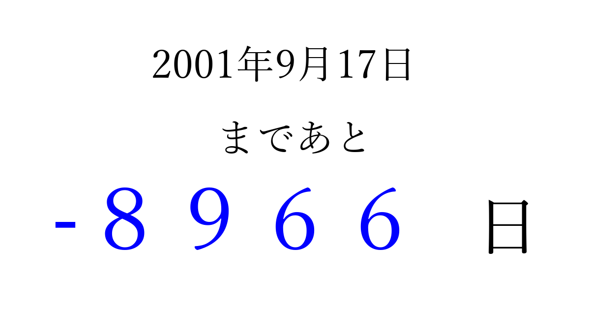 2001年9月17日(月)は もう 0000 日過ぎました 追加すると、トップページからすぐ選べるようになります ※2026/04/05現在の結果です。 最新の状態に更新する ↓シェアして、タイムライン上にカウントダウンを表示しよう!↓ 📤 この結果を共有する Tweet シェア Threads Bluesky 別の日付でカウントダウン 2001年9月のカレンダー このページをブックマークに追加すると、いつでもカウントダウンを確認できます。 (PC: Ctrl+D / Mac: ⌘+D) hitome-notes.comでは以下のページも運営しています。 指定日と期間から日付を計算 | ガチャ確率計算・シミュレーション | プライバシー・ポリシー 運営者:Avocado