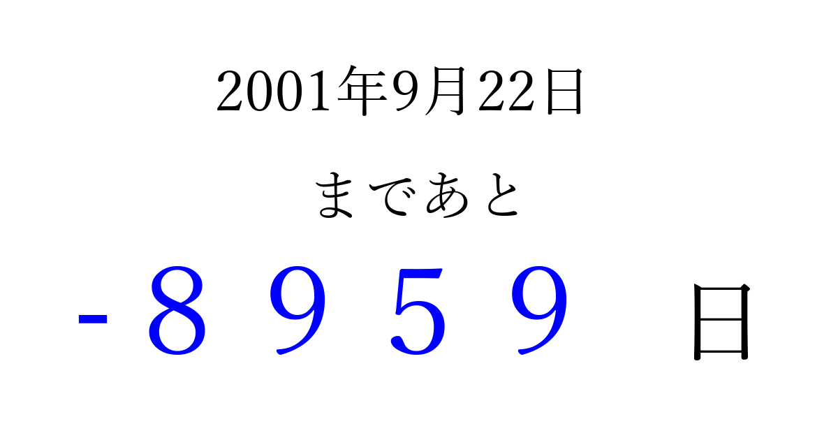 2001年9月22日(土)は もう 0000 日過ぎました 追加すると、トップページからすぐ選べるようになります ※2026/04/03現在の結果です。 最新の状態に更新する ↓シェアして、タイムライン上にカウントダウンを表示しよう!↓ 📤 この結果を共有する Tweet シェア Threads Bluesky 別の日付でカウントダウン 2001年9月のカレンダー このページをブックマークに追加すると、いつでもカウントダウンを確認できます。 (PC: Ctrl+D / Mac: ⌘+D) hitome-notes.comでは以下のページも運営しています。 指定日と期間から日付を計算 | ガチャ確率計算・シミュレーション | プライバシー・ポリシー 運営者:Avocado